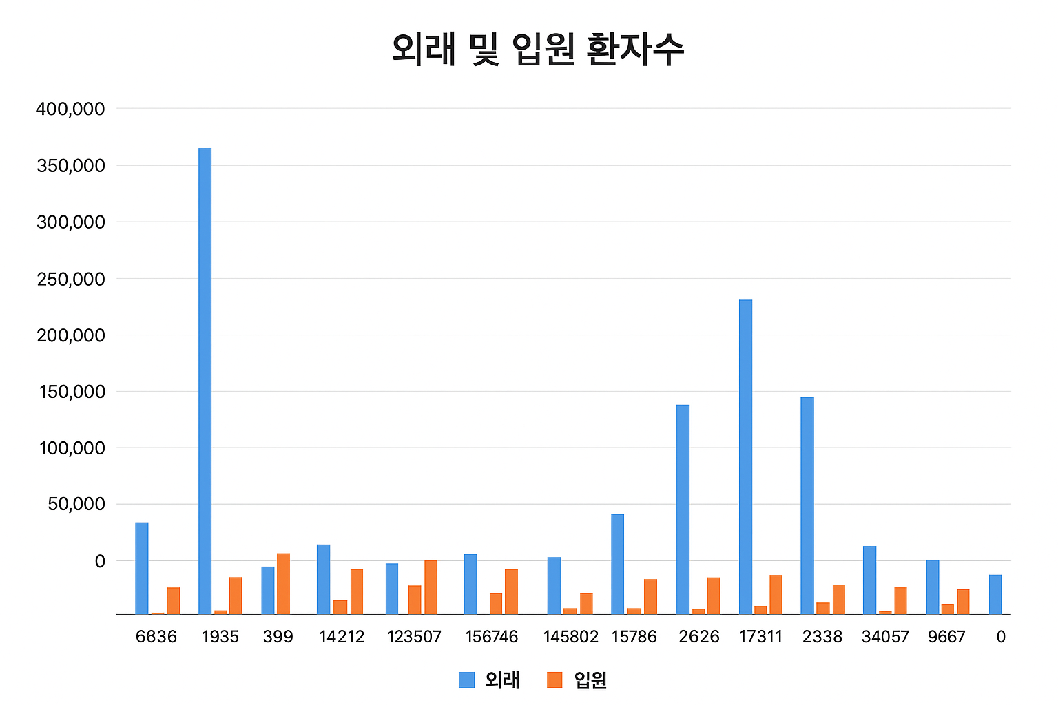 | 질병명 | 외래 환자수 | 입원 환자수 | 총 환자수 |